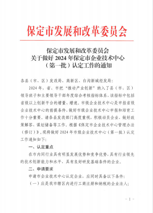 2024年保定市企業(yè)技術(shù)中心(第一批)認定工作的通知