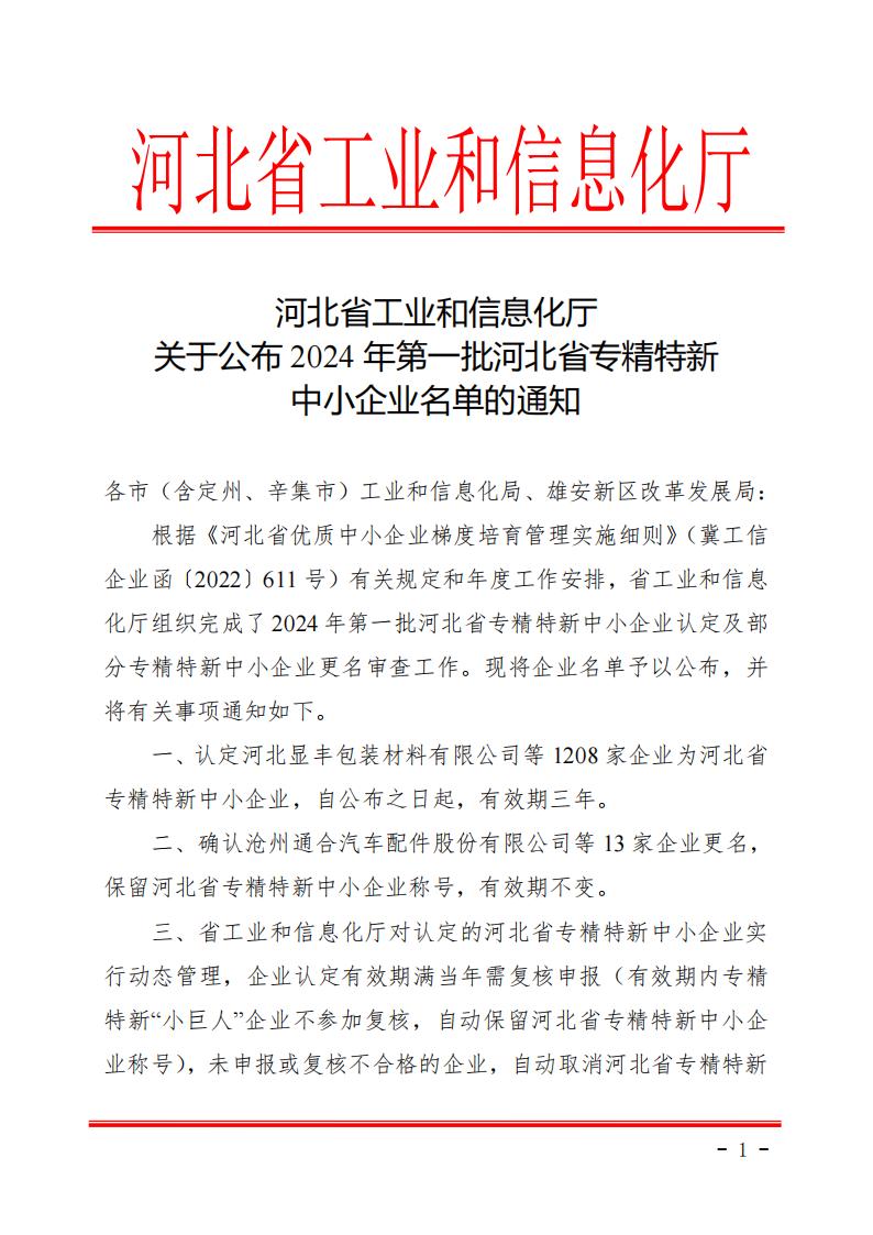 關(guān)于公布2024年第一批河北省專精特新中小企業(yè)名單的通知