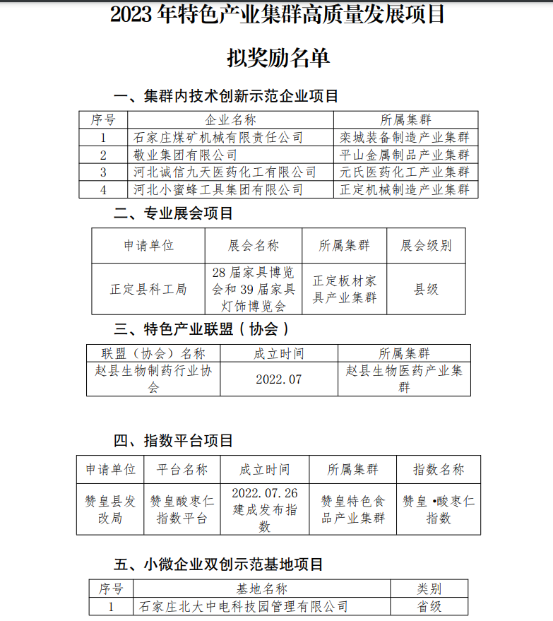 關于2023年特色產(chǎn)業(yè)集群高質(zhì)量發(fā)展項目擬獎勵名單的公示為落實《石家莊市支持特色產(chǎn)業(yè)集群高質(zhì)量發(fā)展的十條政策》,市工信局組織開展了2023