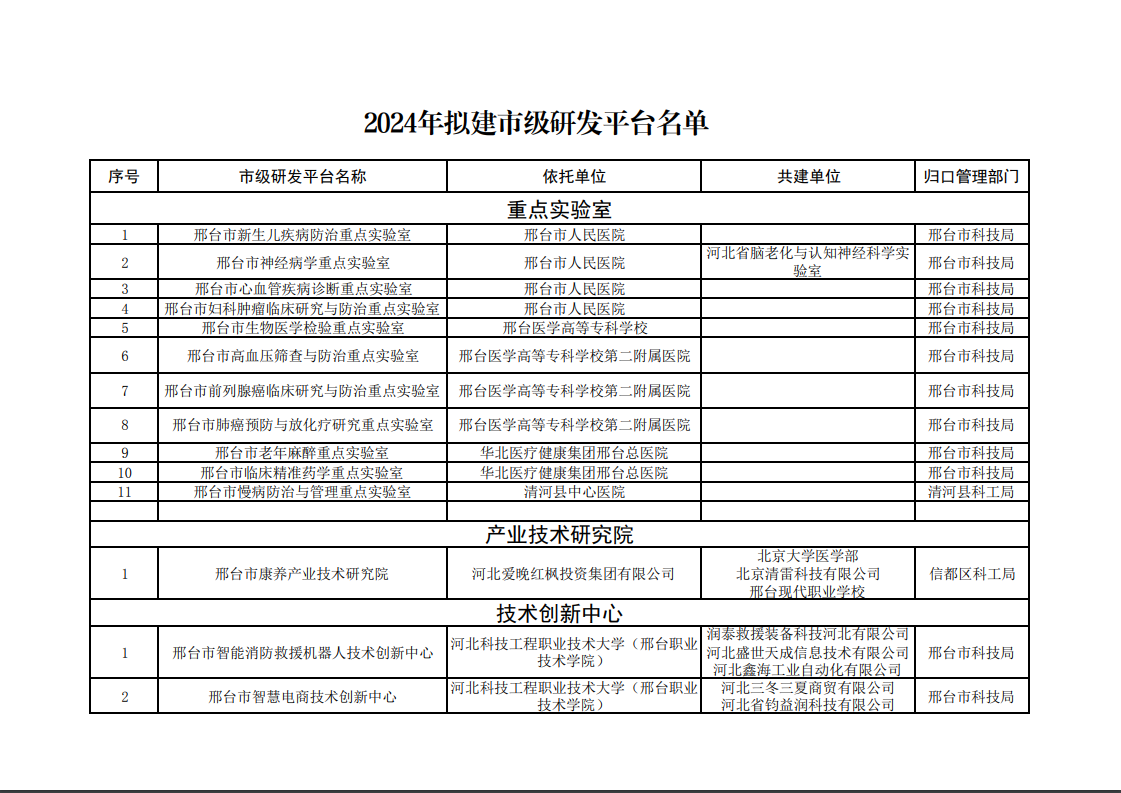 關于對2024年新建邢臺市級研發(fā)平臺的公示按照《邢臺市重點實驗室認定與評估管理辦法》、《邢臺市產(chǎn)業(yè)技術研究院認定與評估管理辦法》和《邢